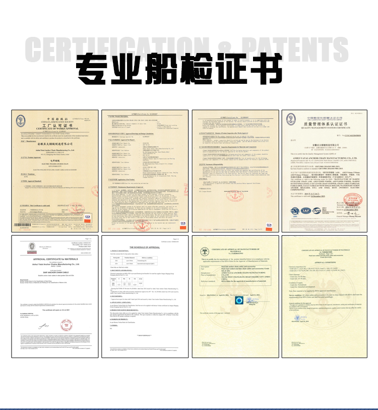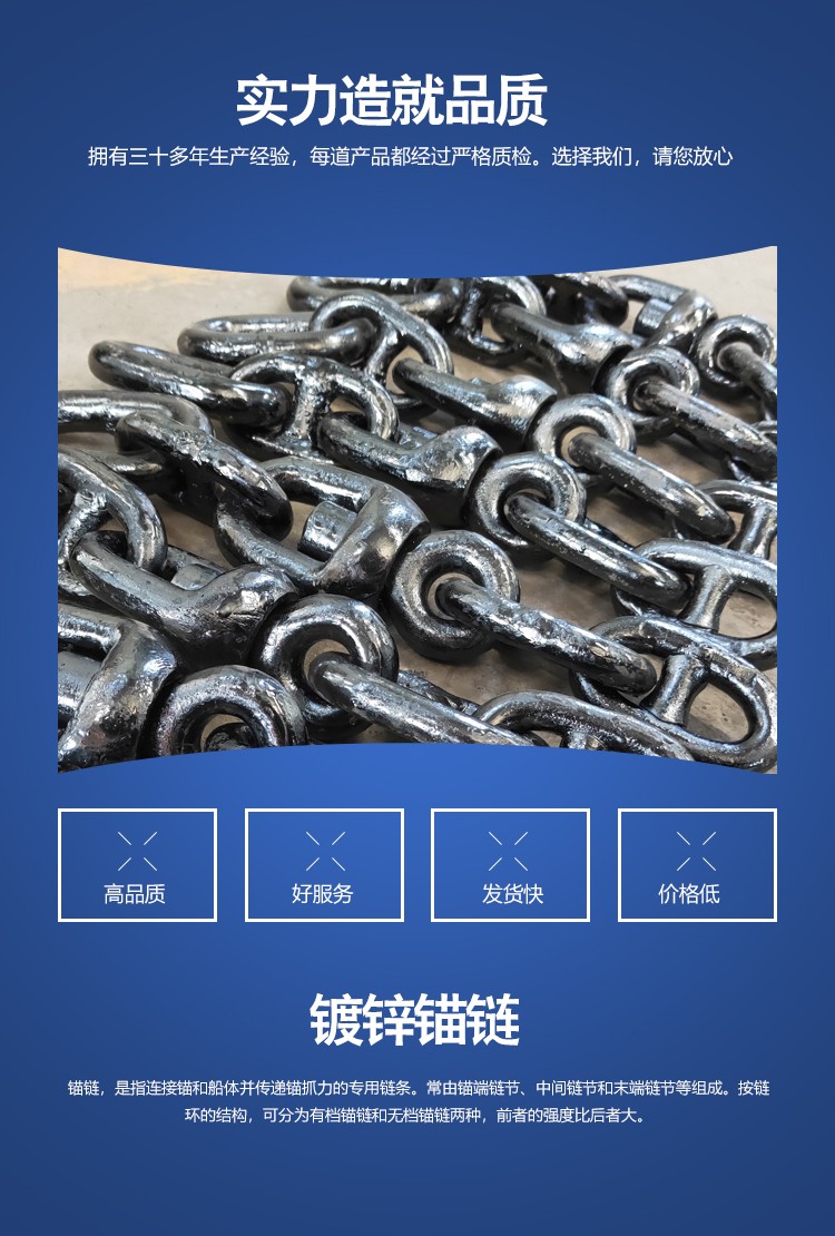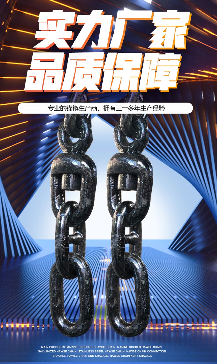 我厂可生产直径Φ12.5mm-直径Φ107mm的有档、无档、二、三级船用锚链。Φ8mm-Φ53mm浮标链;Φ13mm-Φ52mm转环;Φ13mm-Φ65mm连接卸扣;Φ13mm-Φ65mm末端卸扣;Φ13mm-Φ70mm各种材质,各种规格非标准锚链、不锈钢链、加大环、圆环、三角环、环钩等。