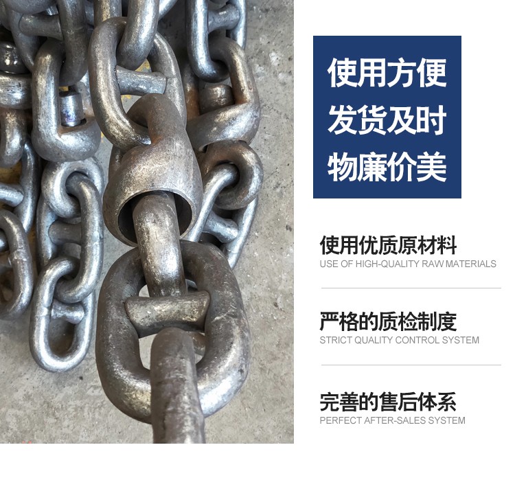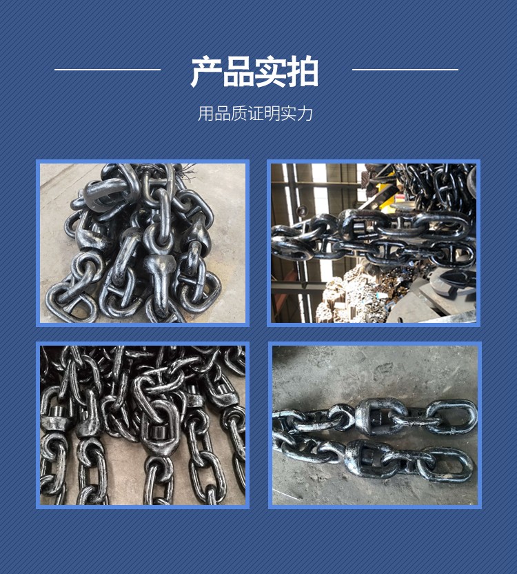 我厂可生产直径Φ12.5mm-直径Φ107mm的有档、无档/二、三级船用锚链。Φ8mm-Φ53mm浮标链;Φ13mm-Φ52mm转环;Φ13mm-Φ65mm连接卸扣;Φ13mm-Φ65mm末端卸扣;Φ13mm-Φ70mm各种材质,各种规格非标准锚链、不锈钢链、加大环、圆环、三角环、环钩等。
