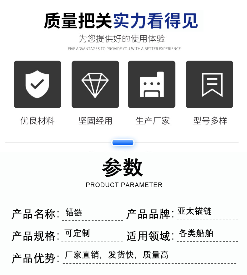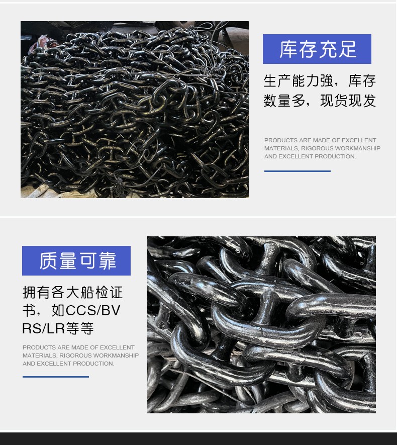 我厂可生产直径Φ12.5mm-直径Φ107mm的有档、无档、二、三级船用锚链。Φ12.5mm-Φ53mm浮标链;Φ12.5mm-Φ52mm转环;Φ12.5mm-Φ65mm连接卸扣;Φ12.5mm-Φ65mm末端卸扣;Φ12.5mm-Φ70mm各种材质,各种规格非标准锚链、不锈钢链、加大环、圆环、三角环、环钩等。