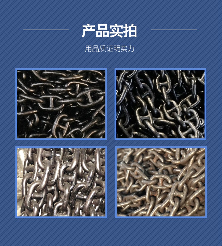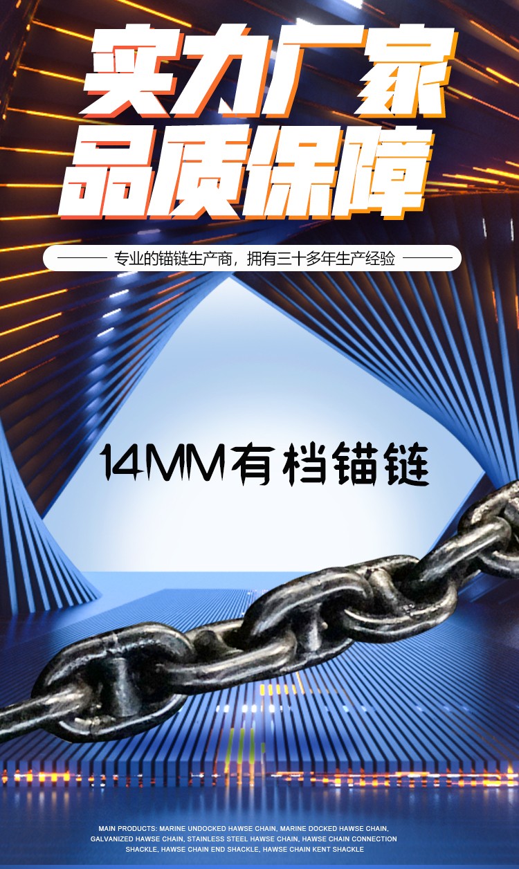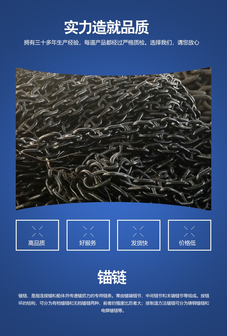 我厂可生产直径Φ12.5mm-直径Φ107mm的有档、无档、二、三级船用锚链。Φ12.5mm-Φ53mm浮标链;Φ12.5mm-Φ52mm转环;Φ12.5mm-Φ65mm连接卸扣;Φ12.5mm-Φ65mm末端卸扣;Φ12.5mm-Φ70mm各种材质,各种规格非标准锚链、不锈钢链、加大环、圆环、三角环、环钩等。